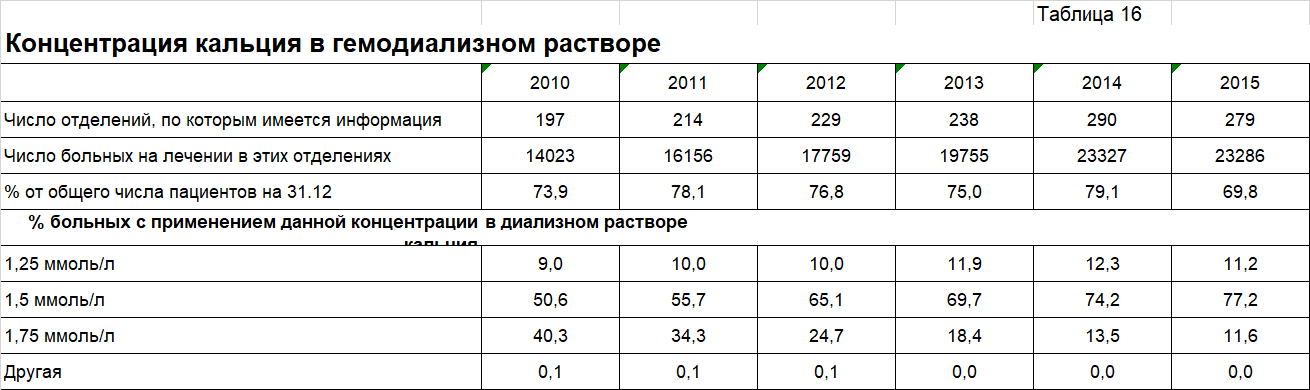 В 2015 г. 279 отделений (63,0%), в которых лечилось 23 286 больных (69,8% от получавших ГД в декабре 2015 г.) прислали в Регистр данные по концентрации кальция в используемом диализном растворе. За период 2010-2015 гг. совершенно отчетливо прослеживается увеличение доли пациентов, получающих ГД с использованием диализирующего раствора с концентрацией кальция 1,5 ммоль/л при уменьшении использования раствора с концентрацией 1,75 ммоль/л и практически постоянной доле пациентов, у которых использовался диализный раствор с концентрацией кальция 1,25 ммоль/л (Табл. 16).